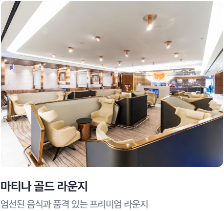 인천공항 제1터미널에 위치한 마티나 라운지는 넓고 고급스러운 분위기로 유명합니다.